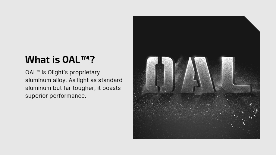 O-aluminum is Olight's proprietary aluminum alloy. As light as standard aluminum but far tougher, it boasts superior performance.