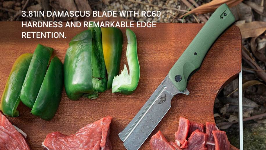 With its eye-catching cleaver-style Damascus blade and OD green handle, this folding knife looks as good as it performs. The stylish design will stand out in your EDC gear collection.